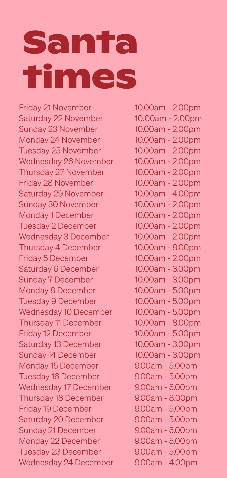 You can visit Santa between times below or book online to secure your perfect session. Choose from a variety of photo packages to suit your family’s needs.